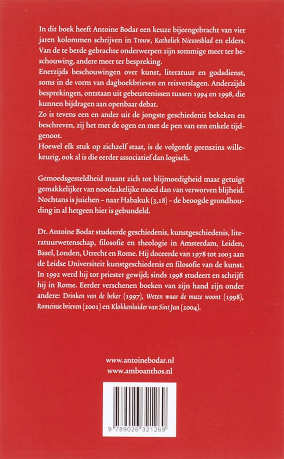 In dit boek heeft Antoine Bodar een keuze bijeengebracht van vierjaren kolommen schrijven in Trouw, Katholiek Nieuwsbladen elders. Van de te berde gebrachte onderwerpen zijn sommige meer ter beschouwing, andere meer ter bespreking. Enerzijds beschouwingen over kunst en literatuur en godsdienst, soms in de vorm van dagboekbrieven en reisverslagen. Anderzijds besprekingen, ontstaan uit gebeurtenissen tussen 1994 en 1998, die kunnen bijdragen aan openbaar debat. Zo is tevens een en ander uit de jongste geschiedenis bekeken en beschreven, zij het met de ogen en met de pen van een enkele tijdgenoot. Hoewel elk stuk op zichzelf staat, is de volgorde geenszins willekeurig, ook al is die eerder associatief dan logisch.