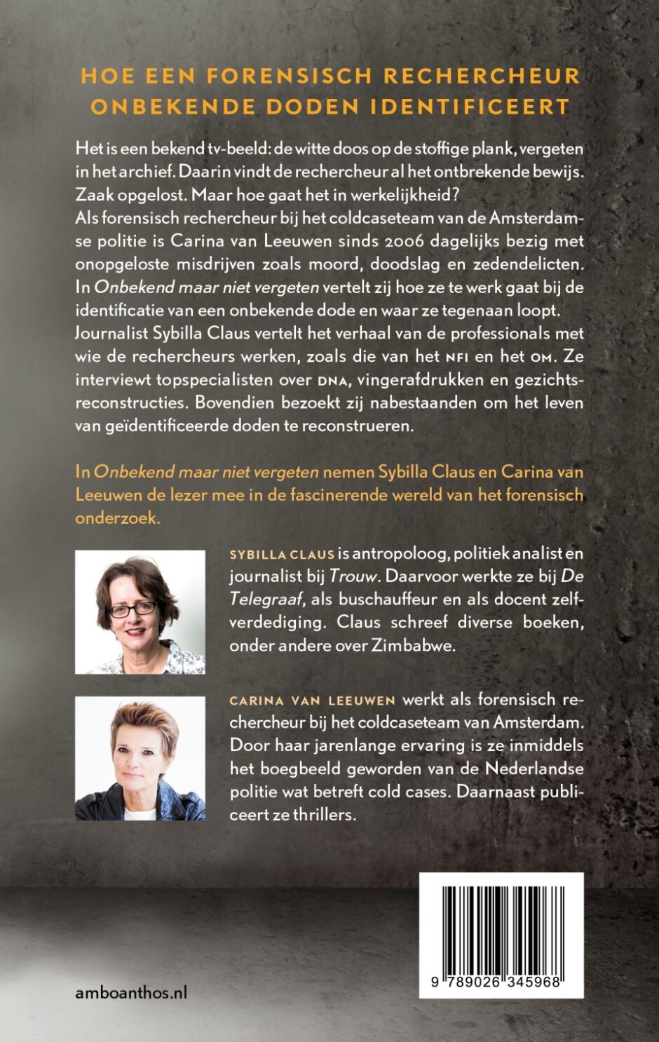 In Onbekend maar niet vergeten nemen Sybilla Claus en Carina van Leeuwen de lezer mee in de fascinerende wereld van het forensisch onderzoek.