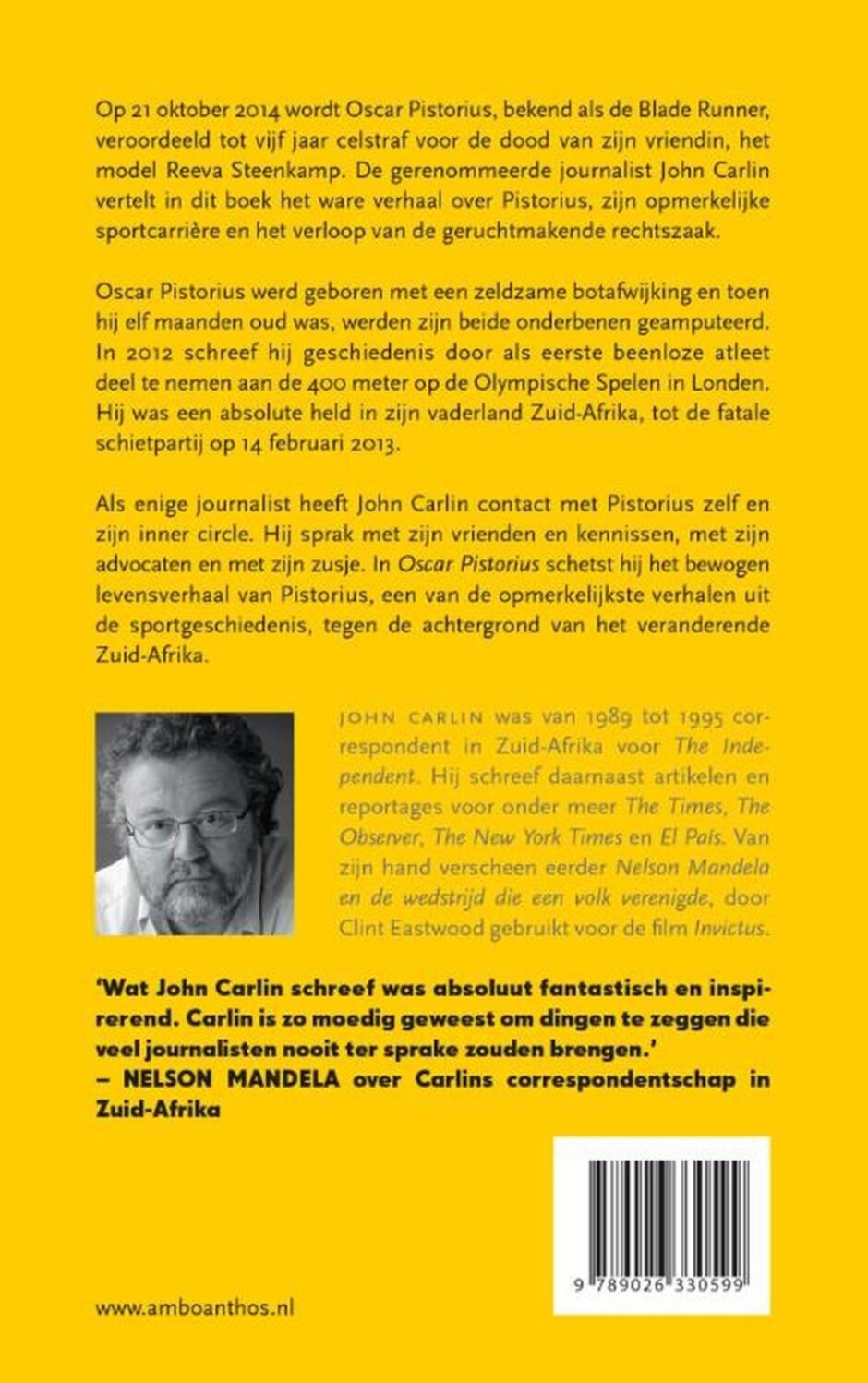 In 'Oscar Pistorius. Het ware verhaal'schetst journalist John Carlin de opmerkelijke sportcarrière van Pistorius, de Blade Runner, en het verloop van de geruchtmakende rechtszaak. Pistorius wordt ervan verdacht zijn vriendin, het model Reeva Steenkamp, te hebben doodgeschoten.
