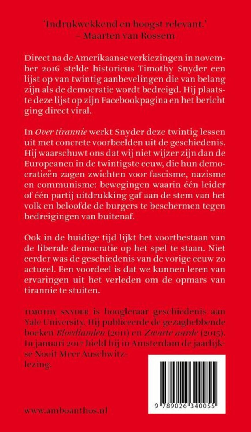Timothy Snyder is hoogleraar geschiedenis aan Yale University. Van zijn hand verscheen in 2009 Bloedlanden. Europa tussen Hitler en Stalin, dat internationaal lovend werd besproken en bekroond werd met onder meer de Hannah Arendt Prijs en de Leipziger Boekenprijs. Samen met Tony Judt publiceerde hij Denken over de twintigste eeuw