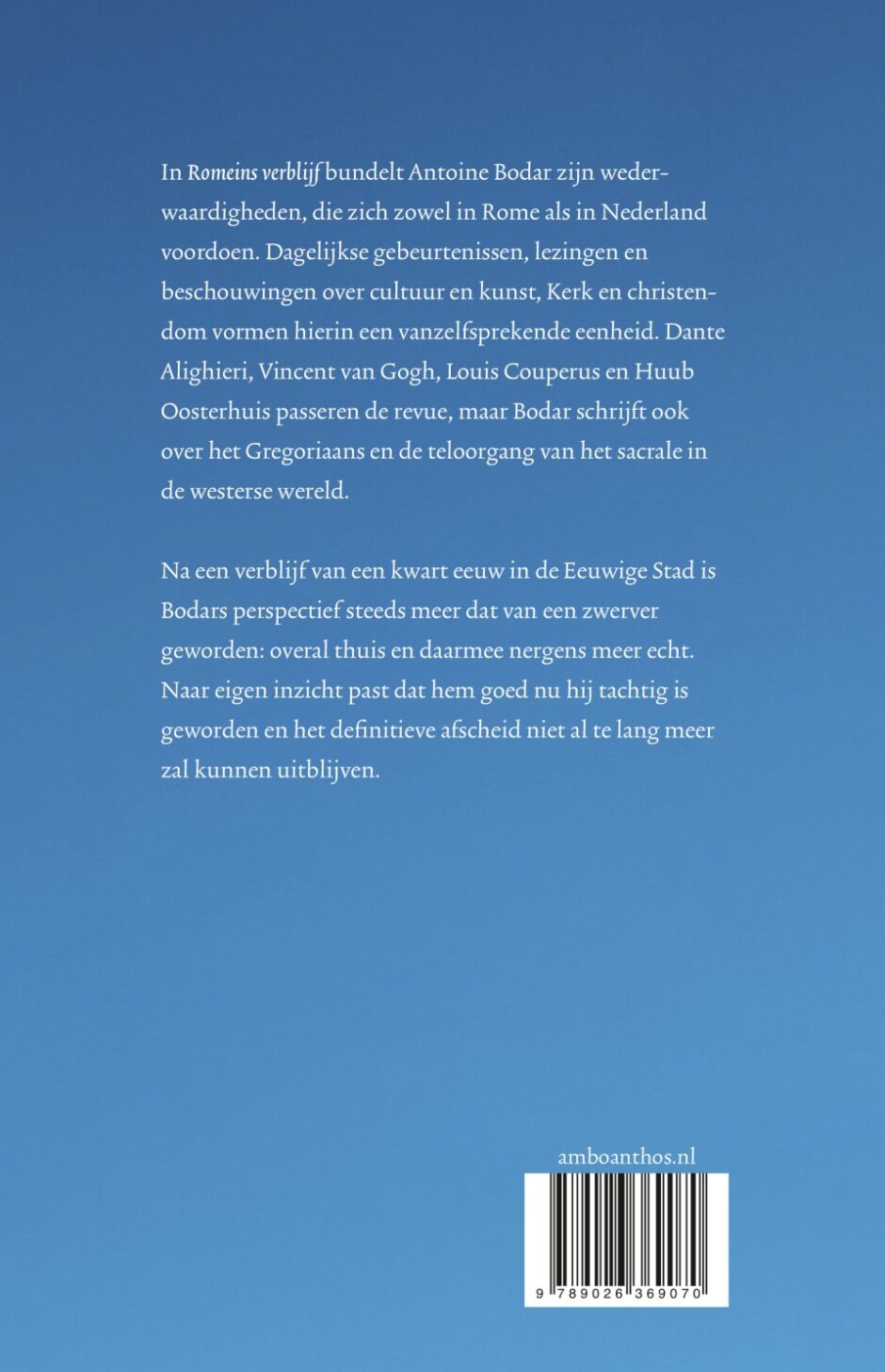 In Romeins verblijf bundelt Antoine Bodar zijn wederwaardigheden die zich zowel in Rome als in Nederland voordoen. Dagelijkse gebeurtenissen, lezingen en beschouwingen over cultuur en kunst, Kerk en christendom vormen hierin een vanzelfsprekende eenheid. Dante Alighieri, Vincent van Gogh, Louis Couperus en Huub Oosterhuis passeren de revue, maar Bodar schrijft ook over het Gregoriaans en de teloorgang van het sacrale in de westerse wereld.