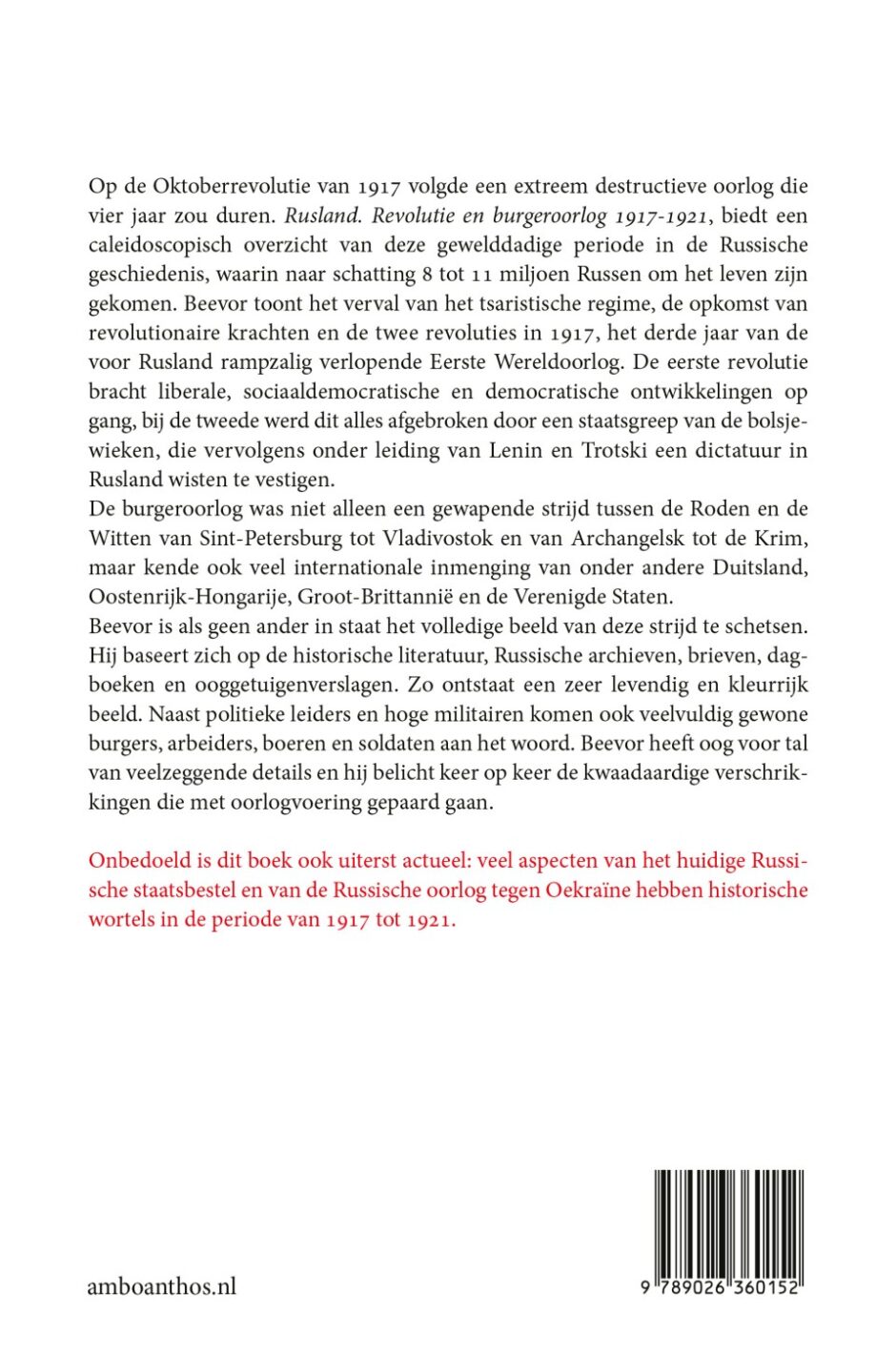 Op de Oktoberrevolutie van 1917 volgde een extreem destructieve oorlog die vier jaar zou duren. Rusland. Revolutie en burgeroorlog 1917-1921, biedt een caleidoscopisch overzicht van deze gewelddadige periode in de Russische geschiedenis, waarin naar schatting 8 tot 11 miljoen mensen om het leven zijn gekomen. Beevor toont het verval van het tsaristische regime, de opkomst van revolutionaire krachten en de twee revoluties in 1917, het derde jaar van de voor Rusland rampzalig verlopende Eerste Wereldoorlog. De eerste revolutie bracht liberale, sociaaldemocratische en democratische ontwikkelingen op gang, bij de tweede werd dit alles afgebroken door een staatsgreep van de bolsjewieken, die vervolgens onder leiding van Lenin en Trotski een dictatuur in Rusland wisten te vestigen.