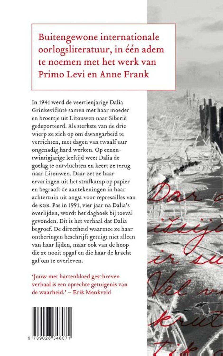 In 1941 werd de veertienjarige Dalia Grinkeviciute samen met haar moeder en broertje uit Litouwen naar Siberië gedeporteerd. Als sterkste van de drie wierp ze zich op om dwangarbeid te verrichten. Op eenentwintigjarige leeftijd weet Dalia de goelag te ontvluchten en keert ze terug naar Litouwen. Daar zet ze haar ervaringen uit het strafkamp op papier en begraaft de aantekeningen in haar achtertuin uit angst voor represailles van de KGB. Pas in 1991, vier jaar na Dalia’s overlijden, wordt het dagboek bij toeval gevonden.