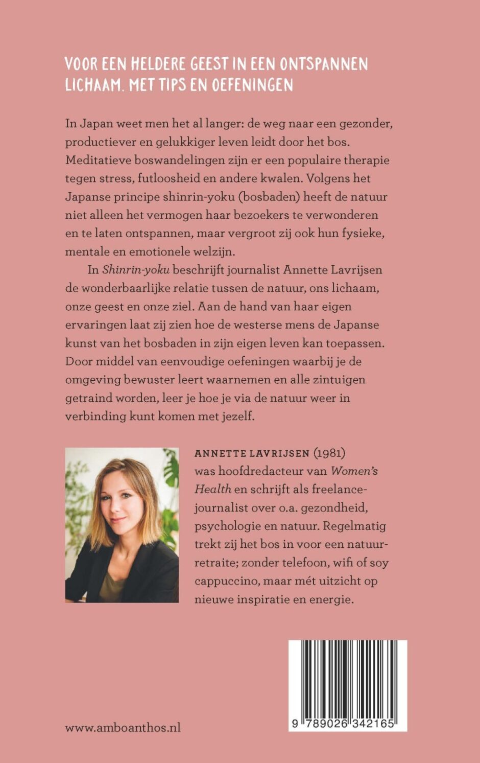 In Shinrin-yoku beschrijft journalist Annette Lavrijsen de wonderbaarlijke relatie tussen de natuur, ons lichaam, onze geest en onze ziel. Aan de hand van haar eigen ervaringen laat zij zien hoe de westerse mens de Japanse kunst van het bosbaden in zijn eigen leven kan toepassen. Door middel van eenvoudige oefeningen waarbij je de omgeving bewuster leert waarnemen en alle zintuigen getraind worden, leer je hoe je via de natuur weer in verbinding kunt komen met jezelf.In Japan weet men het al langer: de weg naar een gezonder, productiever en gelukkiger leven leidt door het bos. Meditatieve boswandelingen zijn er een populaire therapie tegen stress, futloosheid en andere kwalen. Volgens het Japanse principe shinrin-yoku (bosbaden) heeft de natuur niet alleen het vermogen haar bezoekers te verwonderen en te laten ontspannen, maar vergroot zij ook hun fysieke, mentale en emotionele welzijn.