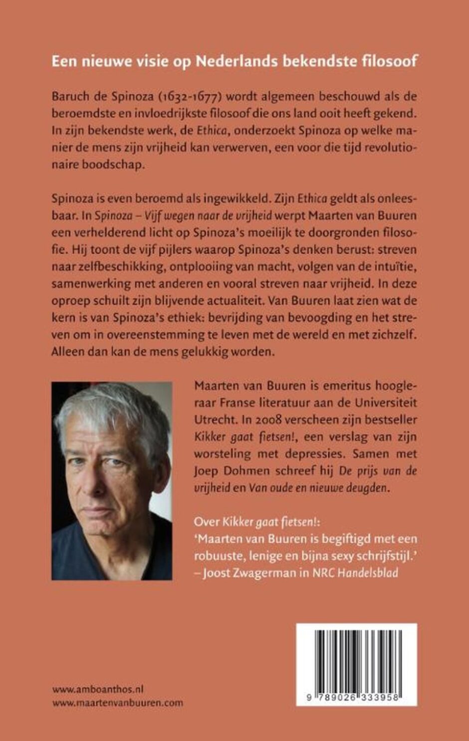 Spinoza is even ingewikkeld als beroemd. Zijn Ethica geldt als onleesbaar. In Spinoza, filosoof van de vrijheid werpt Maarten van Buuren een verhelderend licht op Spinoza's moeilijk te doorgronden filosofie. Hij toont de vijf pijlers waarop Spinoza's denken berust: streven naar zelfbeschikking, ontplooiing van macht, volgen van de intuïtie, samenwerking met anderen en vooral streven naar vrijheid. In deze oproep schuilt zijn blijvende actualiteit. Van Buuren plaatst Spinoza op toegankelijke wijze tussen filosofen die grote invloed hadden op zijn