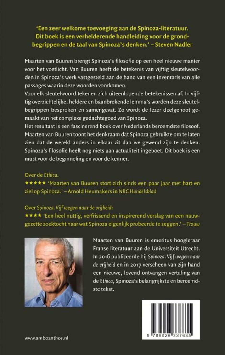 ‘Spinoza. Zijn filosofie in vijftig sleutelwoorden’ van Maarten van Buuren is de opvolger van ‘Spinoza. Vijf wegen naar de vrijheid’ en Maarten van Buurens lovend ontvangen vertaling van Spinoza’s ‘Ethica’. Van Buuren heeft de betekenis van vijftig sleutelwoorden in Spinoza’s werk vastgesteld aan de hand van een inventaris van alle passages waarin deze sleutelwoorden voorkomen. In vijftig overzichtelijke, heldere en baanbrekende lemma’s worden deze sleutelwoorden besproken en samengevat. Het resultaat is een verhelderende handleiding voor de grondbegrippen uit het werk van Nederlands beroemdste filosoof, wiens filosofie sinds de Verlichting niets aan actualiteit heeft ingeboet.