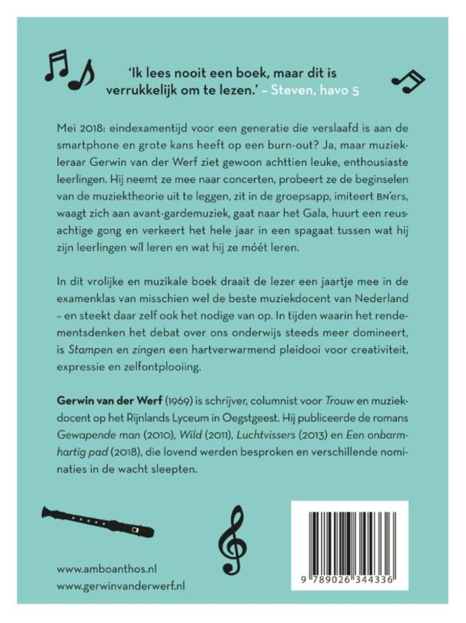 In Stampen en zingen, een vrolijk en muzikaal boek, draait de lezer een jaartje mee in de examenklas van misschien wel de beste muziekdocent van Nederland – en steekt daar zelf ook het nodige van op. In tijden waarin het rendementsdenken het debat over ons onderwijs steeds meer domineert is Stampen en zingen van Gerwin van der Werf een hartverwarmend pleidooi voor creativiteit, expressie en zelfontplooiing.