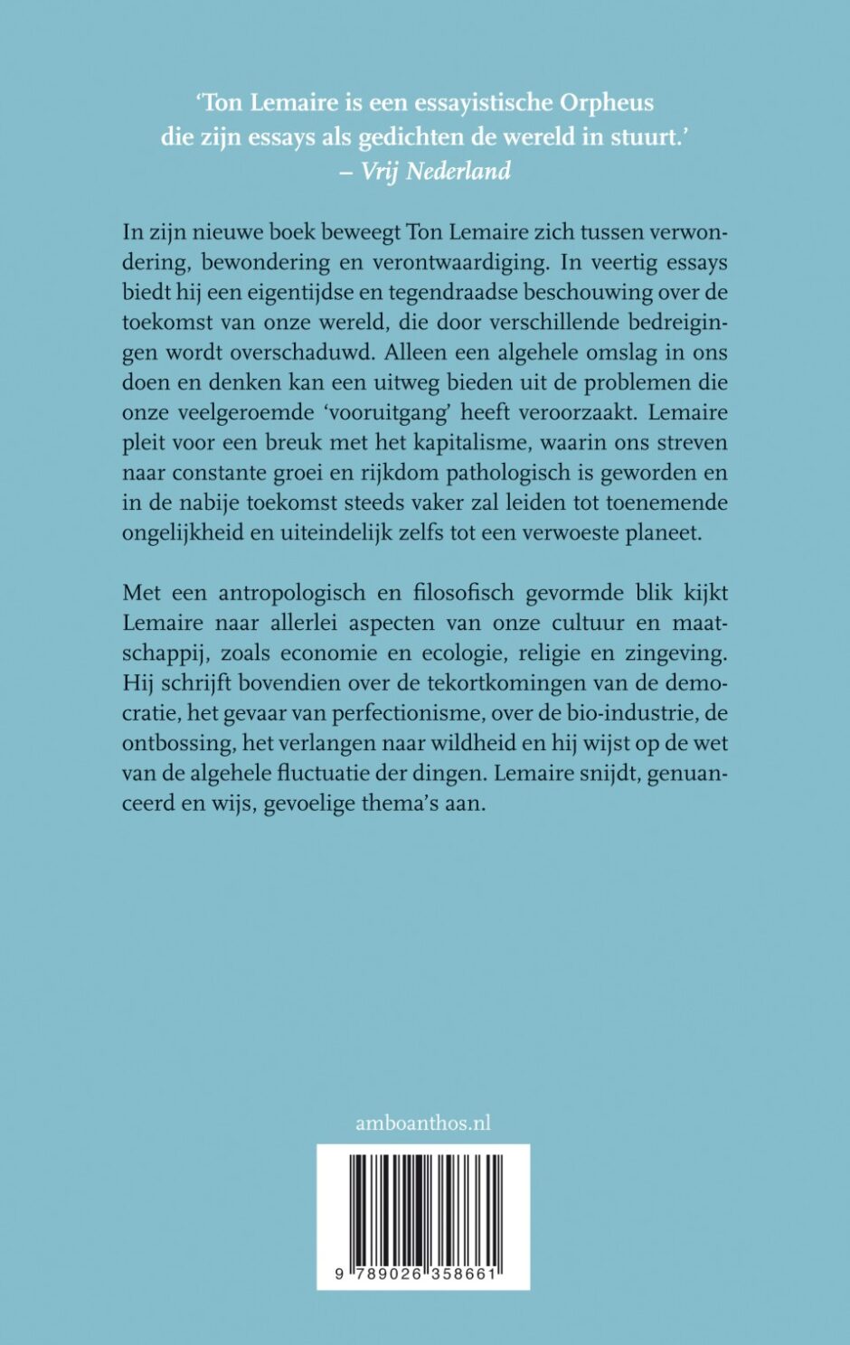 In zijn nieuwe boek Tegen de tijd beweegt Ton Lemaire zich tussen verwondering, bewondering en verontwaardiging. In veertig essays biedt hij in Tegen de tijd een eigentijdse en tegendraadse beschouwing over de toekomst van onze wereld, die door verschillende bedreigingen wordt overschaduwd. Alleen een algehele omslag in ons doen en denken kan een uitweg bieden uit de problemen die onze veelgeroemde ‘vooruitgang’ heeft veroorzaakt. Ton Lemaire pleit voor een breuk met het kapitalisme, waarin ons streven naar constante groei en rijkdom pathologisch is geworden en in de nabije toekomst steeds vaker zal leiden tot toenemende ongelijkheid en uiteindelijk zelfs tot een verwoeste planeet.