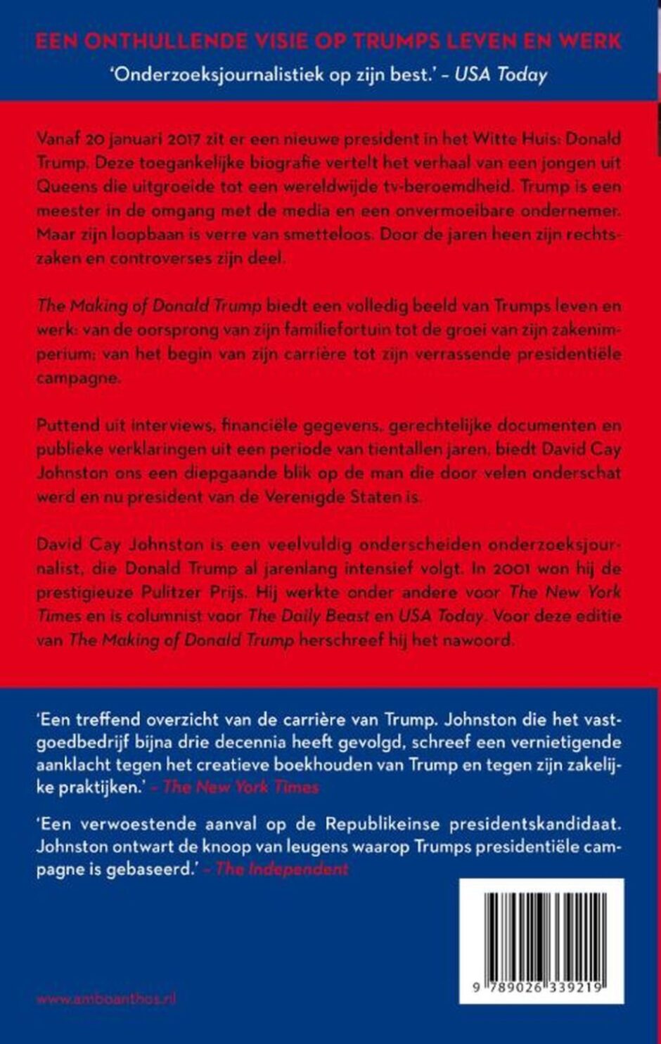 Na de hectische Amerikaanse verkiezingen zit er vanaf 20 januari 2017 een nieuwe president in het Witte Huis: Donald Trump. 'The making of Donald Trump' is een toegankelijke biografie waarin Johnston het verhaal vertelt van een jongen uit Queens die uitgroeide tot een wereldwijde tv-beroemdheid. Trump is een meester in de omgang met de media en een onvermoeibare ondernemer. Maar zijn loopbaan is verre van smetteloos. Door de jaren heen zijn rechtszaken en controverses zijn deel.