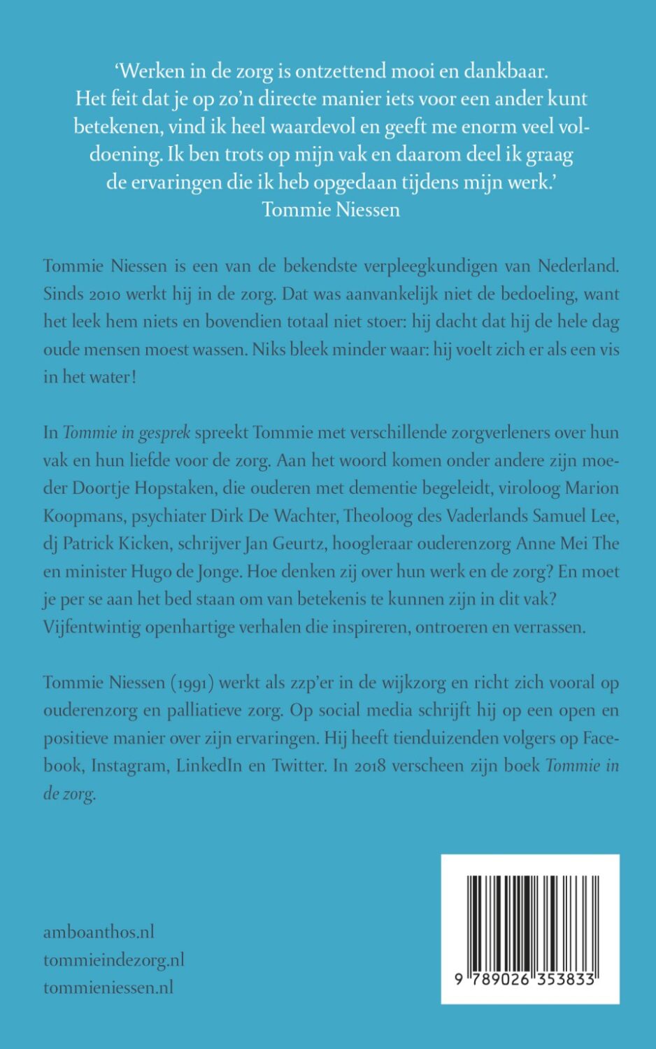 ‘Werken in de zorg is superinteressant en dankbaar werk. Het feit dat je op zo’n directe manier iets voor een ander kunt betekenen, vind ik heel waardevol en geeft me veel voldoening. Ik ben heel trots op mijn vak en daarom deel ik zo graag mijn mooie ervaringen. In mijn nieuwe boek, dat voortkomt uit Tommie de Podcast, ga ik in gesprek met allerlei inspirerende mensen die in de zorg werken. Wat ik vooral van hen wil weten is “Wat betekent zorg voor jou?”’