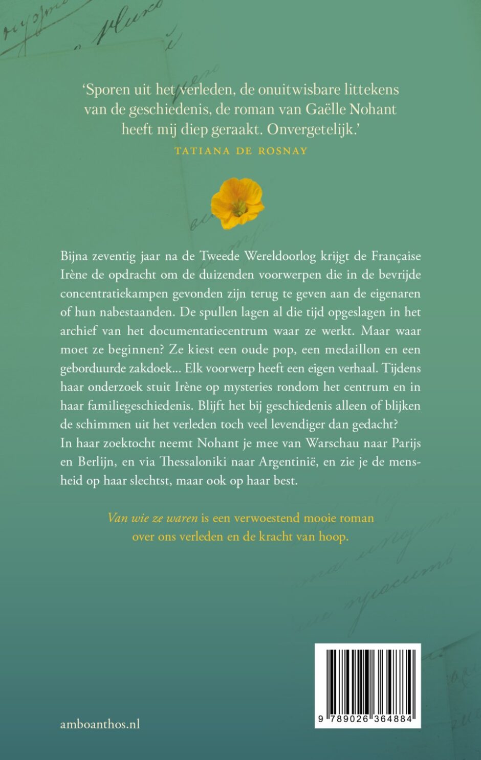 In haar zoektocht neemt Nohant je mee van Warschau naar Parijs en Berlijn, via Thessaloniki naar Argentinië, en zie je de mensheid op haar slechtst, maar ook op haar best. Van wie ze waren is een verwoestend mooie roman over ons verleden en de kracht van hoop.