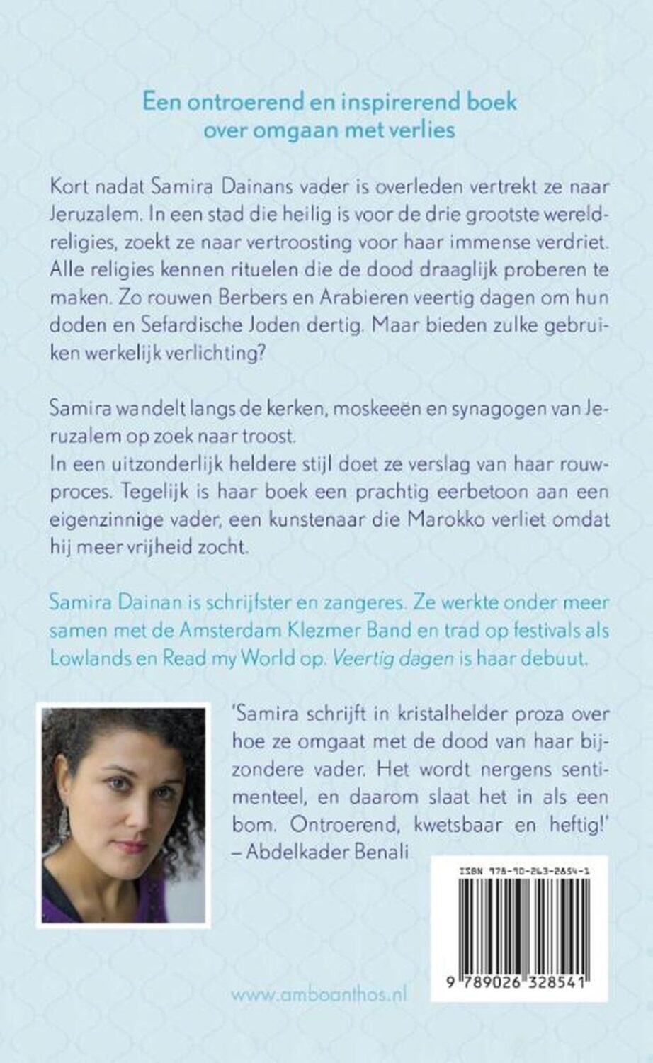 Veertig dagen is een ontroerend en inspirerend boek voor iedereen die ooit met verlies heeft moeten omgaan. Kort nadat Samira Dainans vader is overleden vertrekt ze naar Jeruzalem. In een stad die heilig is voor de drie grootste wereldreligies, zoekt ze naar vertroosting voor haar immense verdriet. Voor alle lezers van Mitch Albom en Isa Hoes.