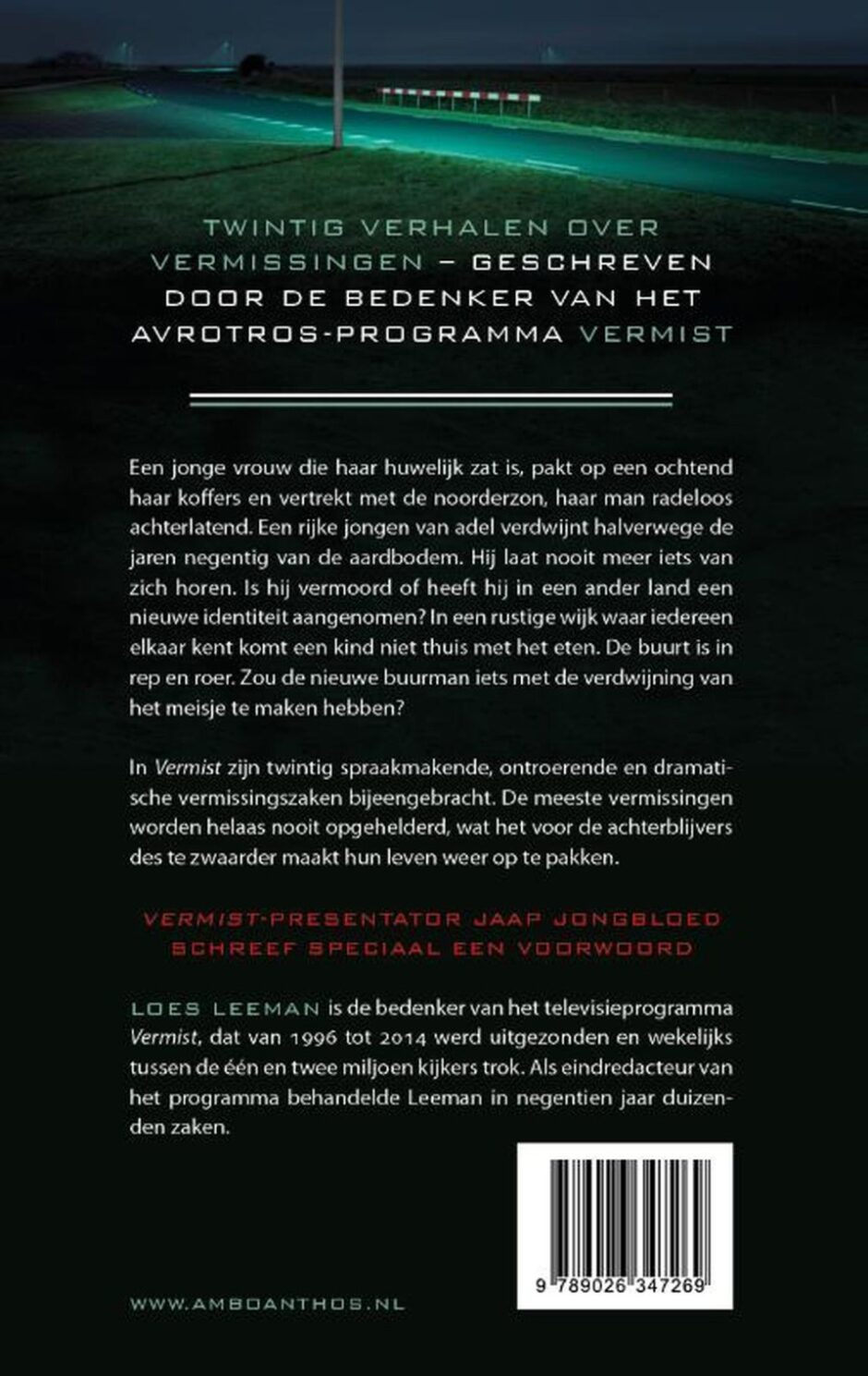 In ‘Vermist’ van Loes Leeman zijn twintig spraakmakende, ontroerende en dramatische vermissingszaken bijeengebracht. Een aantal zaken kwam eerder aan bod in het populaire tv-programma Vermist, deze zaken zijn voor dit boek uitgebreid en geactualiseerd.