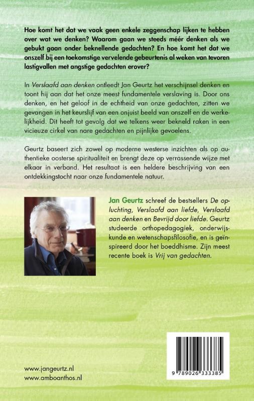 In Verslaafd aan denken ontleedt Jan Geurtz het verschijnsel denken, en toont hij aan dat het onze meest fundamentele verslaving is. Door ons denken, en het geloof in de echtheid van onze gedachten, zitten we gevangen in het keurslijf van een onjuist beeld van onszelf en de werkelijkheid. Dit heeft tot gevolg dat we telkens weer bekneld raken in een vicieuze cirkel van nare gedachten en pijnlijke gevoelens.