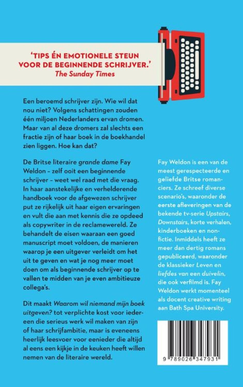 Waarom wil niemand mijn boek uitgeven? van Fay Weldon is een must voor elke beginnende schrijver die wil weten wat je níét moet doen om wél uitgegeven te worden. In dit handboek voor afgewezen schrijvers legt Weldon uit waarom je manuscript keer op keer wordt afgewezen en geeft ze tips hoe je ervoor kunt zorgen dat jouw boek wél opvalt en gelezen wordt.