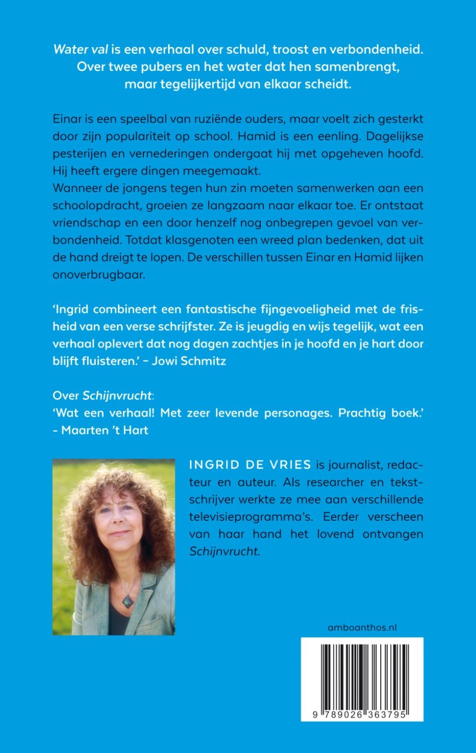 Water val is een verhaal over schuld, troost en verbondenheid. Over twee pubers en het water dat hen samenbrengt, maar tegelijkertijd van elkaar scheidt.