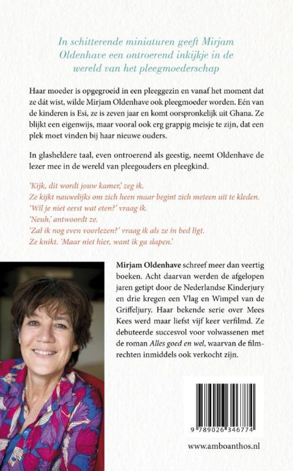 Mirjam Oldenhave, auteur van de Mees Kees-serie, geeft in ‘Weet ik veel’ een inkijkje in de wereld van het pleegmoederschap. Ze is pleegmoeder van de negenjarige Esi, die oorspronkelijk uit Ghana komt. Als dochter van een moeder die is opgegroeid in een pleeggezin wist Mirjam al vroeg dat ze ook pleegmoeder wilde worden. Esi blijkt een erg leuk, maar vooral ook erg eigenwijs meisje te zijn dat een plek moet vinden bij haar nieuwe ouders. In glasheldere taal neemt Oldenhave in ‘Weet ik veel’ de lezer mee in de wereld van pleegouders en pleegkind. Een ontroerend boek over wennen, regels, verhoudingen, onmacht en communicatie, maar vooral over liefde en plezier. ‘Weet ik veel’ is ontroerend als de verhalen van Annie M.G. Schmidt en helder als de columns van Martin Bril. Mirjam Oldenhave schreef meer dan veertig jeugdboeken. Haar succesvolste serie is die over Mees Kees. In 2017 debuteerde ze voor volwassenen met haar eerste roman ‘Alles goed en wel’, waarvan de filmrechten verkocht zijn.