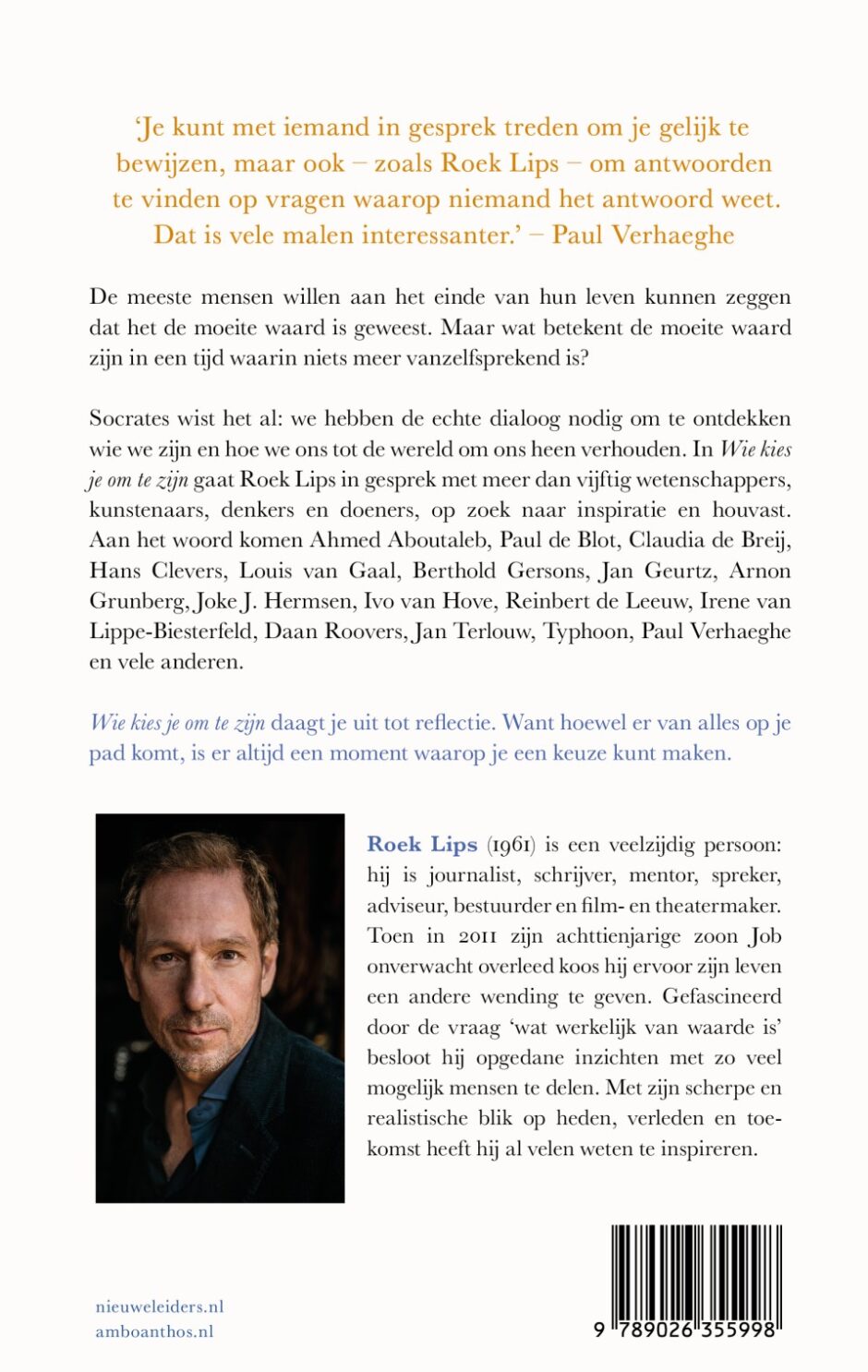 In Wie kies je om te zijn gaat Roek Lips in gesprek met meer dan honderd wetenschappers, kunstenaars, denkers en anderen – allen met een bijzondere levenservaring – op zoek naar inspiratie en houvast. De meeste mensen willen aan het einde van hun leven kunnen zeggen dat het de moeite waard is geweest. Maar wat betekent de moeite waard zijn in een tijd waarin niets meer vanzelfsprekend is? In Wie kies je om te zijn deelt Roek Lips de mooiste verhalen en inzichten en daagt je als lezer uit tot reflectie. Want ondanks alles wat er op je pad komt, is er altijd een moment waarin je een keuze kunt maken.