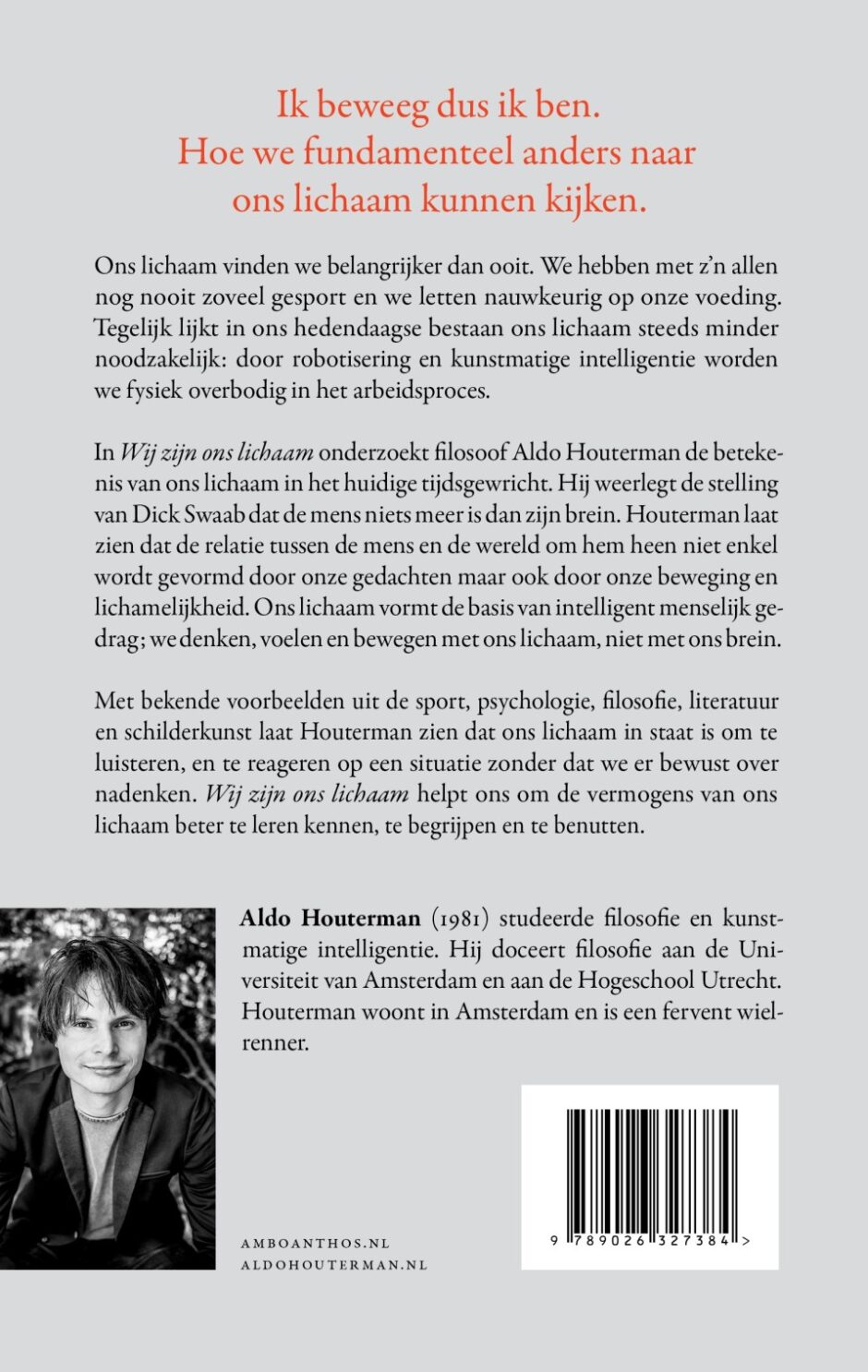 In Wij zijn ons lichaam laat filosoof Aldo Houterman zien hoe we ons lichaam beter kunnen begrijpen en gebruiken. Ik beweeg, dus ik ben. Ons lichaam is belangrijk dan ooit, we hebben met z’n allen nog nooit zo veel gesport en we letten nauwkeurig op onze voeding. Tegelijk lijkt ons lichaam steeds minder nodig te zijn: door robotisering en artificial intelligence worden we overbodig in het arbeidsproces.