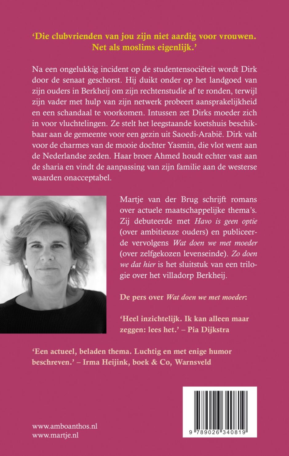Martje van der Brug schreef eerder 'Havo is geen optie' en 'Wat doen we met moeder'. In 'Zo doen we dat hier' van Martje van der Brug wordt Dirk na een ongelukkig incident op de studentensociëteit door het bestuur geschorst. Hij duikt onder op het landgoed van zijn ouders in Berkheij om zijn rechtenstudie af te ronden, terwijl zijn vader met behulp van zijn netwerk probeert aansprakelijkheid en een schandaal te voorkomen. Ondertussen zet Dirks moeder zich in voor vluchtelingen. Ze stelt het leegstaande koetshuis beschikbaar aan de gemeente voor een gezin uit Saoedi-Arabië. Dirk valt voor de charmes van de mooie dochter Yasmin, die zich vlot aanpast aan de Nederlandse zeden. Haar broer Ahmed houdt echter vast aan de sharia en vindt de aanpassing van zijn familie aan de Westerse waarden onacceptabel. Martje van der Brug heeft het talent heikele sociale kwesties op spitsvondige wijze bespreekbaar te maken en doet dat briljant in 'Zo doen we dat hier'.