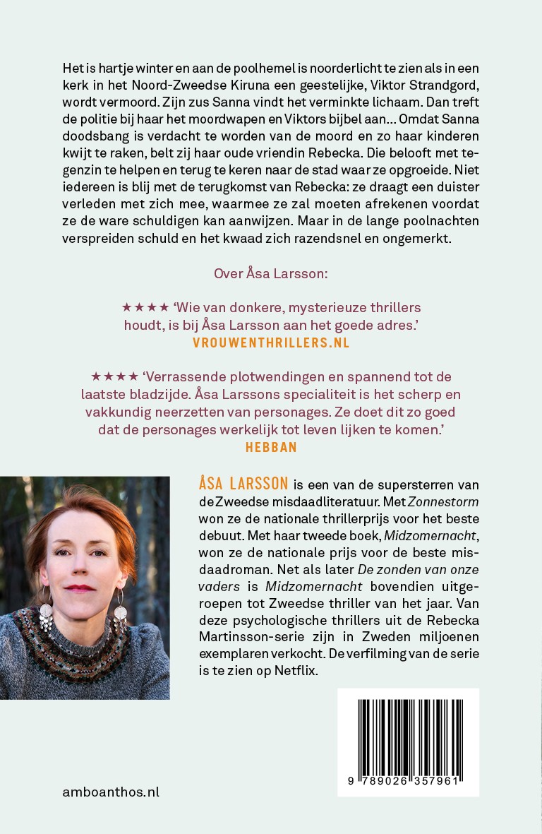 Zonnestorm van Åsa Larsson is het eerste deel van de Rebecka Martinsson-serie. Het is hartje winter en aan de poolhemel is noorderlicht te zien als in een kerk in het Noord Zweedse Kiruna een geestelijke, Viktor Strandgord, wordt vermoord. Zijn zus Sanna vindt het verminkte lichaam. Dan treft de politie bij haar het moordwapen en Viktors bijbel aan...